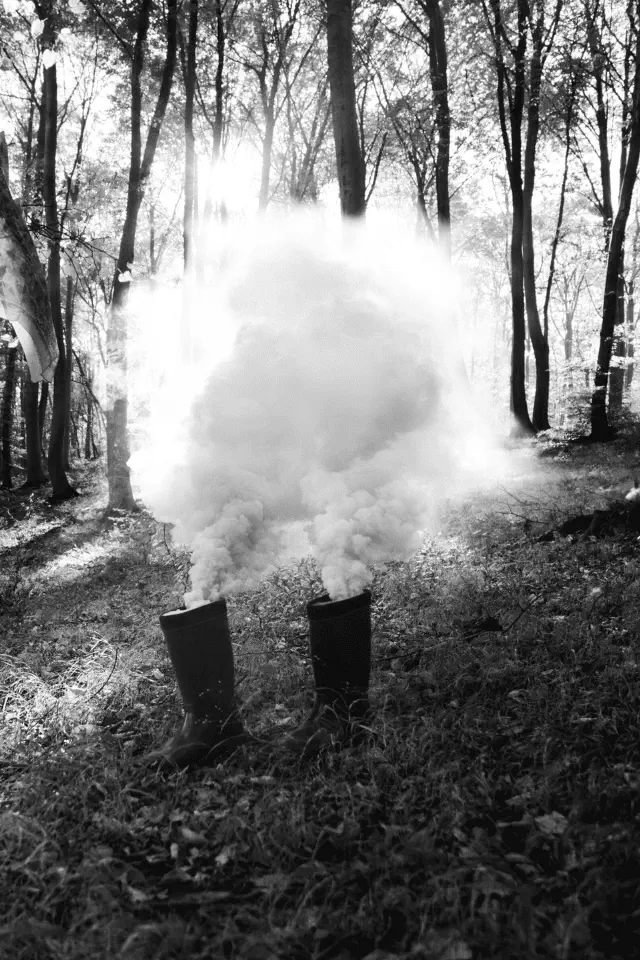 Una persona invisibile, rappresentata solo da stivali da cui esce del fumo in una foresta, simbolo del desiderio di scomparire e della ricerca di sé.